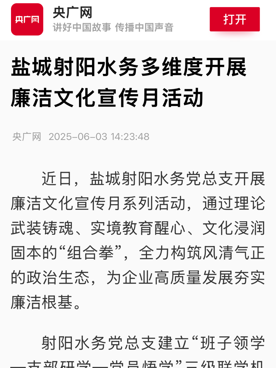 人民網(wǎng)、央廣網(wǎng)報道中國水務(wù)所屬華東區(qū)域總部多方“廉”動,擦亮廉潔底色